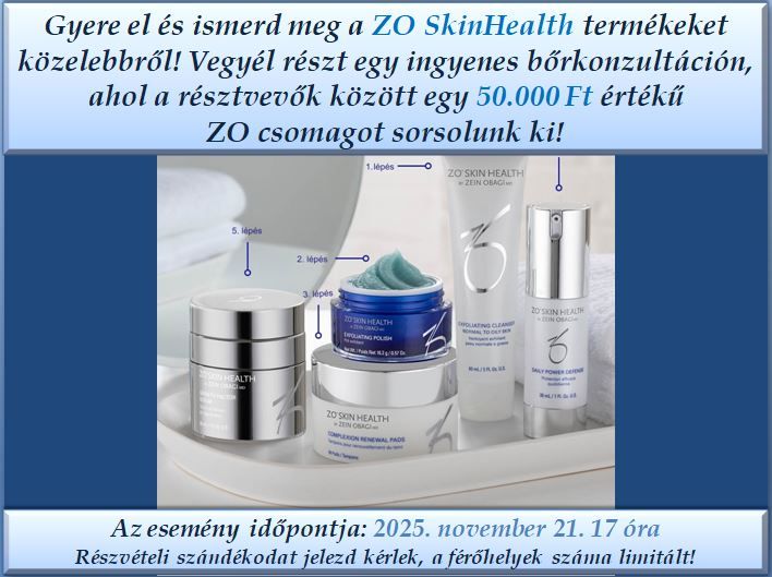 Gyere el és ismerd meg a ZO SkinHealth termékeket közelebbről! Vegyél részt egy ingyenes bőrkonzultáción, ahol a résztevők között egy 50.000 Ft értékú ZO csomagot sorsolunk ki! Az esemény időpontja: