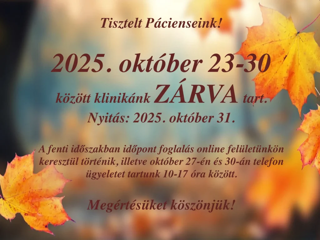 Tisztelt Pácienseink! 2025. október 23-30 között klinikánk ZÁRVA tart. Nyitás: 2025. október 31. A fenti időszakban időpont foglalás online felületünkönkeresztül történik, illetve október 27-én és 30-án telefonügyeletet tartunk 10-17 óra
